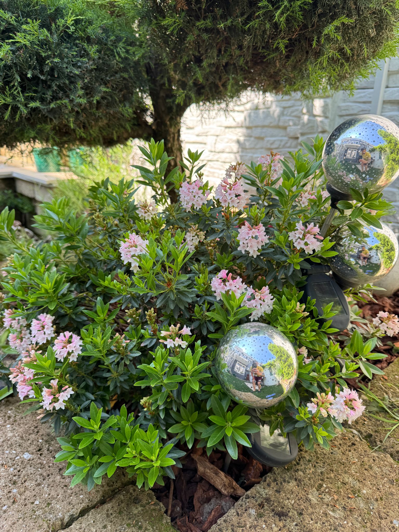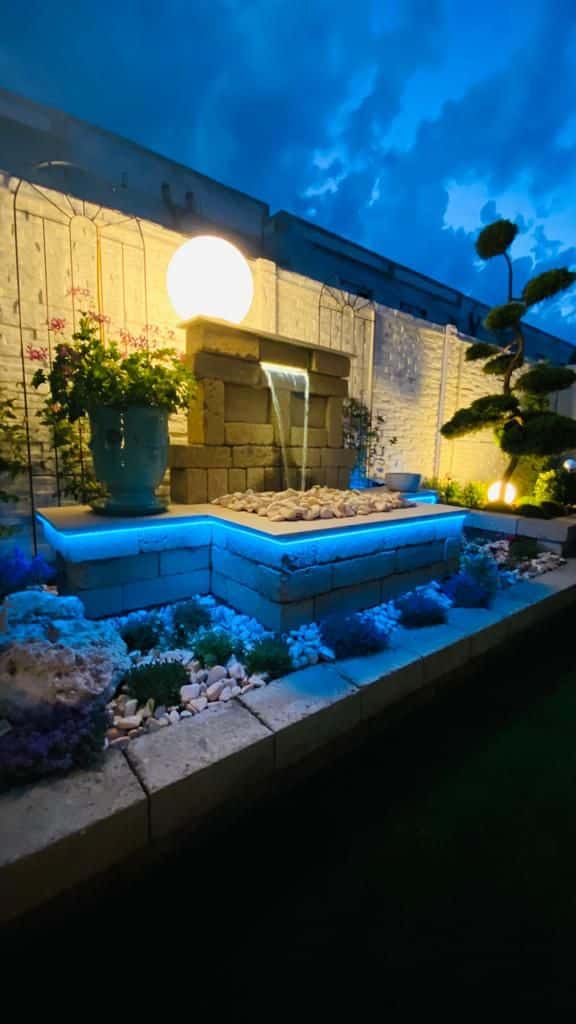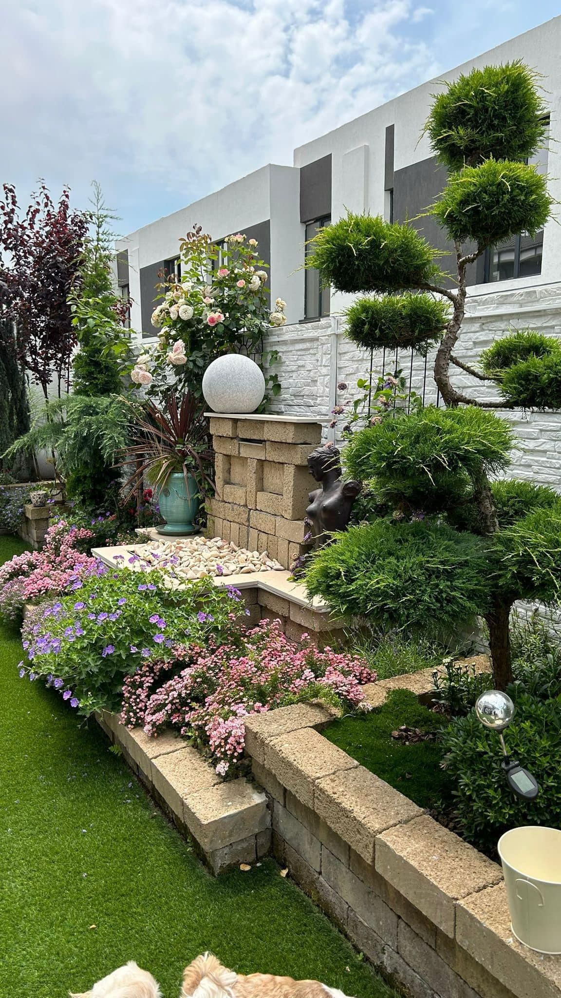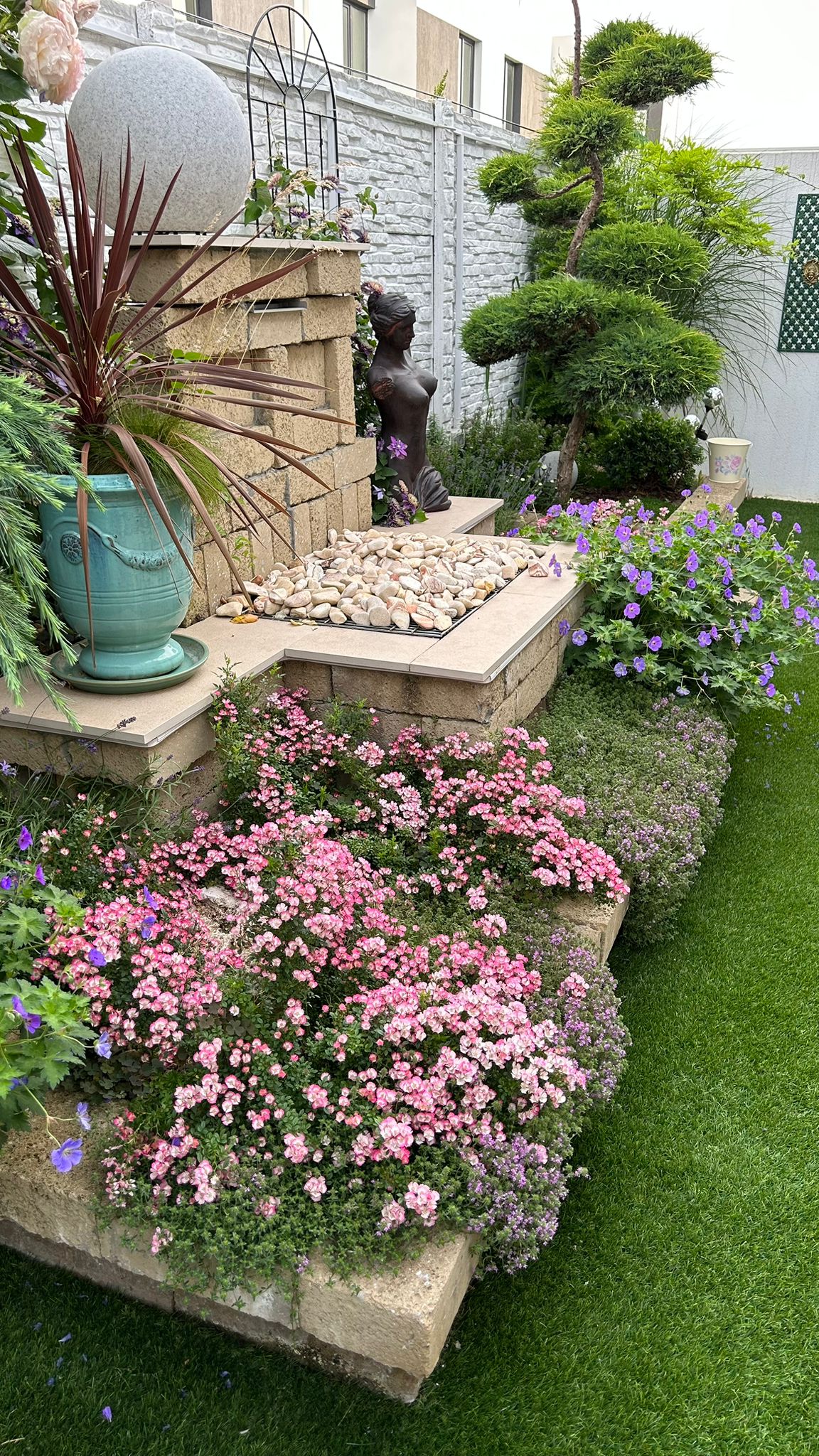 În zona restrânsă din fața terasei, am conceput și montat jardiniere etajate, construite din blocuri modulare, care definesc niveluri și limite vizuale. În ele am combinat plante cu texturi și ritm diferit: hortensii pe zona de umbra, lavandă, trandafiri pitici și plante care coboara peste marginile jardinierei.