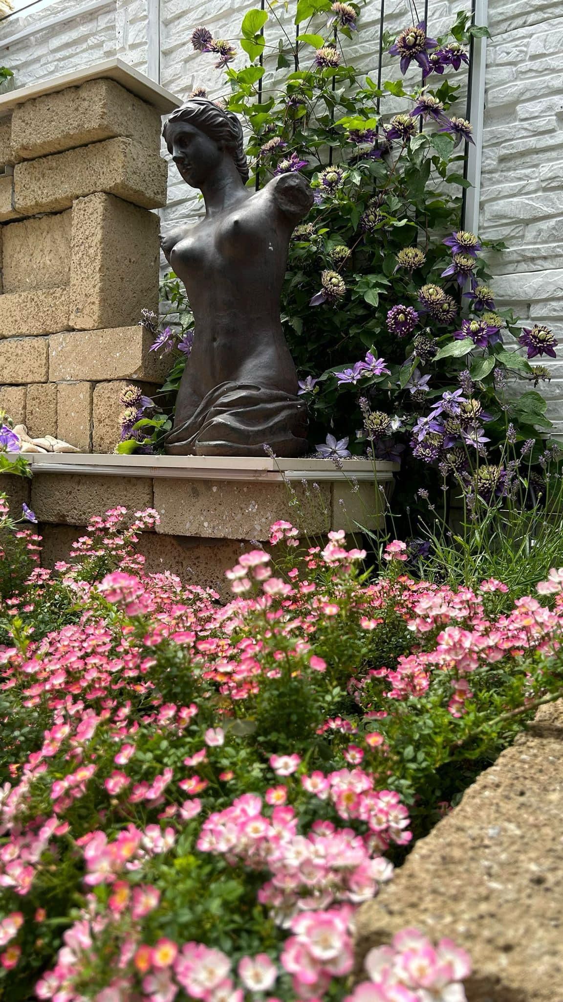 Am adăugat câteva accesorii discrete – o statuetă în ton cu estetica sobru-naturală, un vas ceramic decorativ care adaugă greutate și repere vizuale și câteva pietre decorative , poziționate astfel încât să completeze structura fără să monopolizeze atenția. Verdele domină, însă nuanțat de florile pastelate și de accentele verticale ale plantelor.